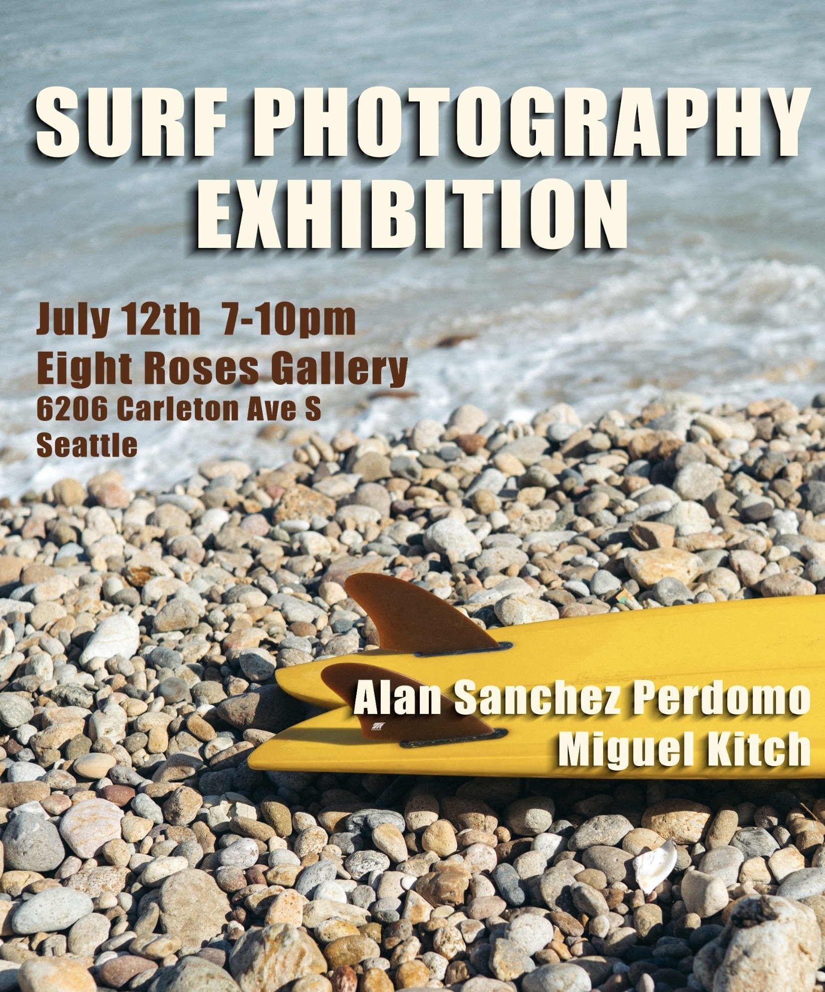 Surf Photography Exhibition Saturday, July 12, 2025 7:00 PM 10:00 PM Google Calendar ICS Dates: July 12 - August 3 Artist: Alan Sanchez P. & Miguel KitchFrom the rugged waves of the Pacific Northwest to the golden breaks of Mexico. Featuring raw PNW surf photos by Miguel Kitch and dreamy Mexican waves by Alan Sanchez P.